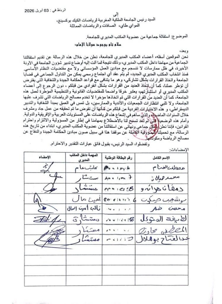 المعطيات التي كشف عنها بيان منسوب لعدد من أعضاء المكتب المديري، توصلت به منصة “mmamag”، لا تُقرأ فقط باعتبارها تصفية حسابات داخلية، بل كعرض تفصيلي لاختلالات يُشتبه في أنها بنيوية، تتعلق بأسلوب اتخاذ القرار، وتدبير الموارد، والعلاقة مع مختلف مكونات المنظومة. فالأعضاء المستقيلون يتحدثون عن “نمط تسيير فردي” يتجاوز المؤسسات، حيث تُتخذ القرارات – وفق روايتهم – خارج أي إطار تشاوري، في تغييب واضح لأدوار المكتب المديري، الذي يفترض أنه السلطة التداولية الأولى داخل الجامعة.