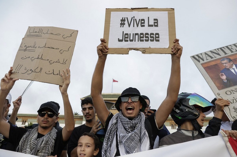 Des manifestants brandissent des pancartes lors d'une manifestation menée par des jeunes, place Mohammed V à Casablanca, le 6 octobre 2025. Ils réclament des réformes de la santé publique et de l'éducation. Abdel Majid BZIOUAT / AFP